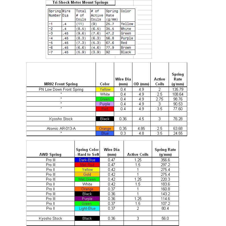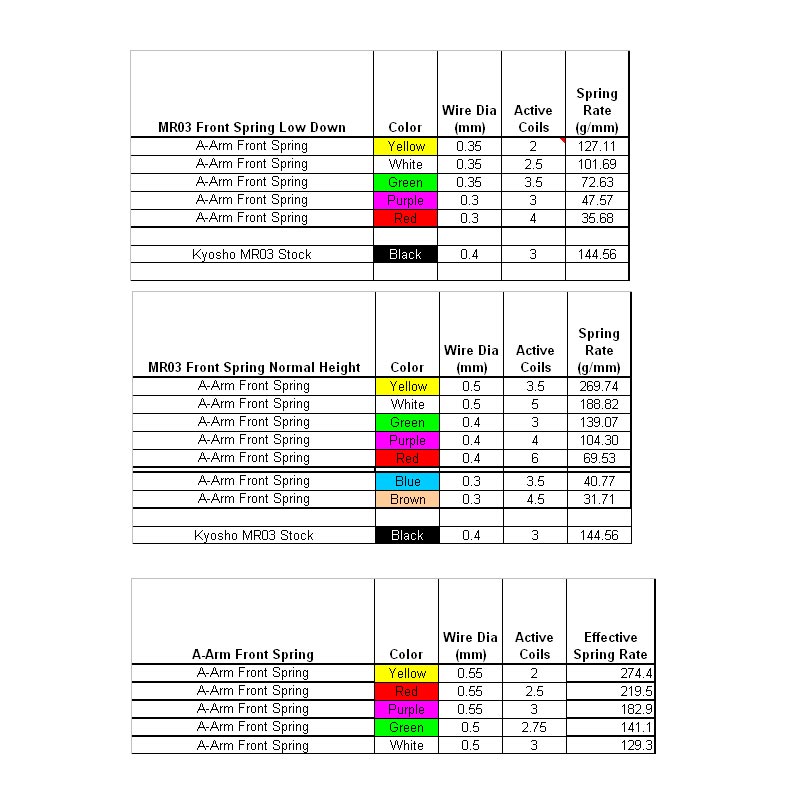 Note that for spring rates for MR03 and MR02 A-Arm suspension that the spring rate is given at the wheel. The actual spring have different spring rate, but due to moment arm, rate at wheel is different than for the actual spring.