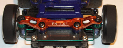 Suspension like the PN double A-arm front suspension or the MR03 strut suspension has camber gain. This means that as the wheel travels up, suspension geometry cause the wheel to increase in camber. This means that during cornering, the outside wheel will travel up due to lean of the car. With camber gain, the front wheel will still be parallel to the ground. The advantage is that you get better traction in the corners. Many racers have shown the double A-arm to decrease their lap times. The MR03 front suspension that also have camber gain. However, parts of it will have to be changed to lower the car first before it can be very competitive.